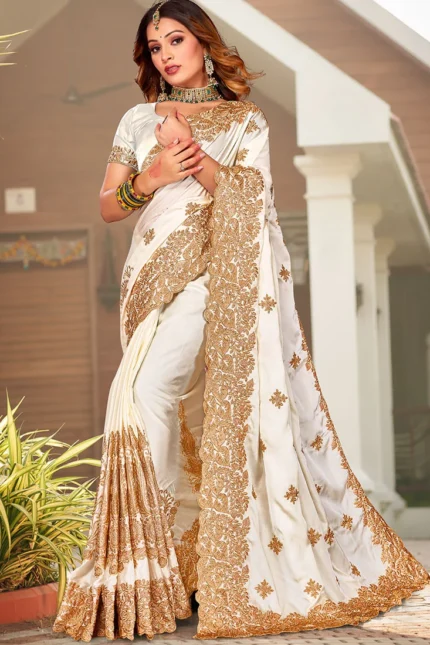 Off White Satin Blend Embroidered Saree Party Wear