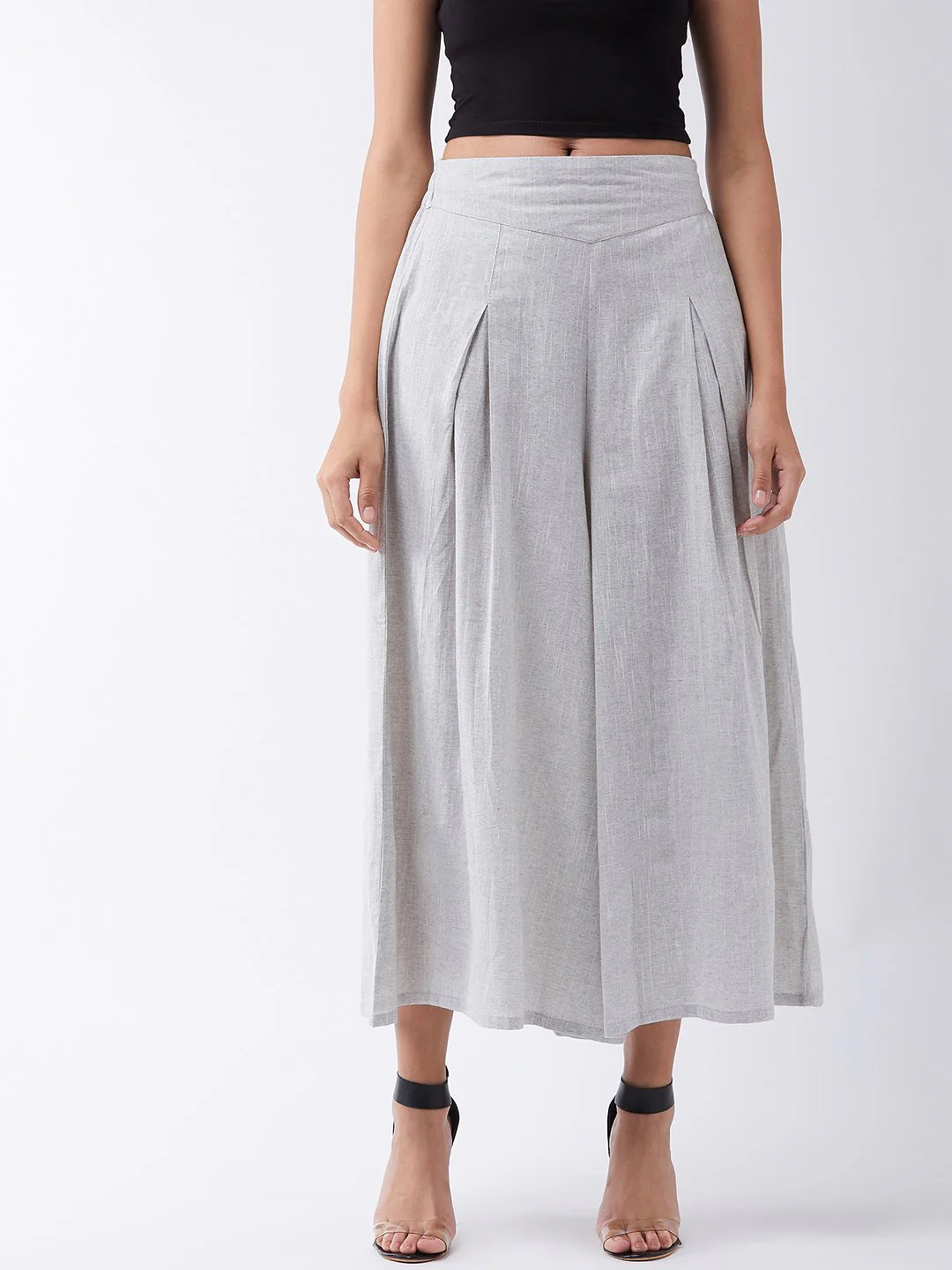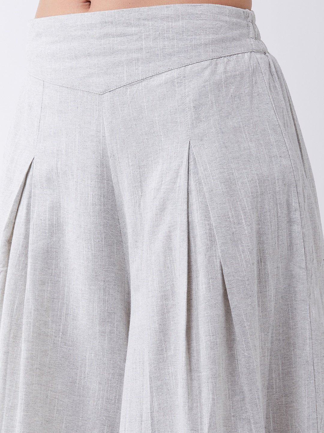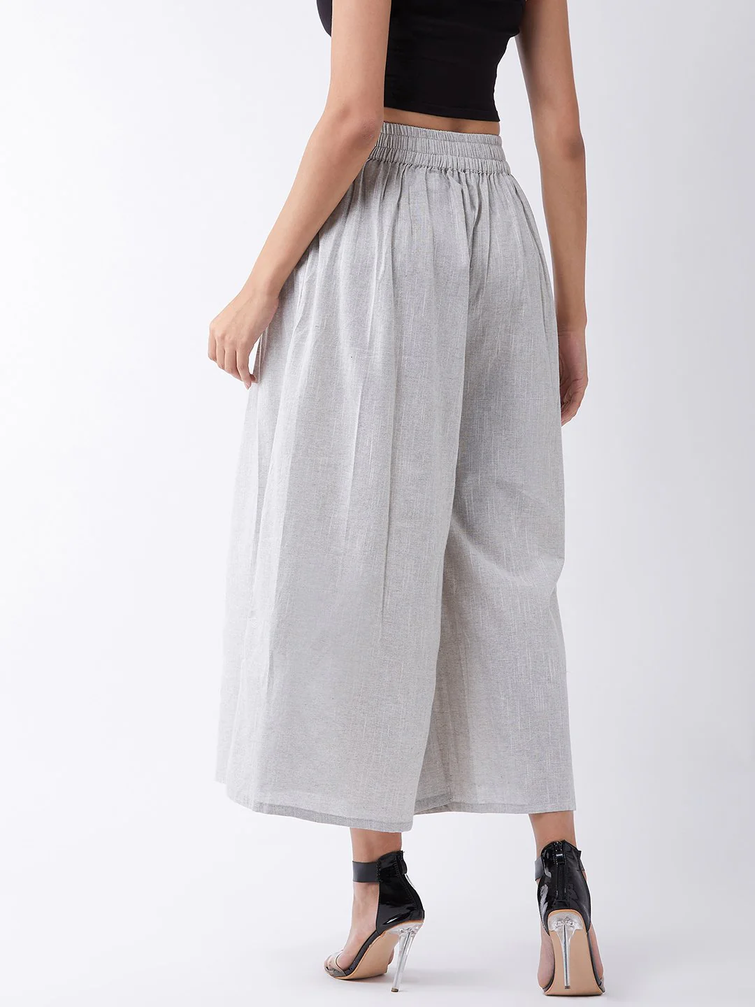 Embrace the spirit of summer with this pair of cool, gray-colored handloom palazzos. These cropped palazzos are made with original cotton fabric and showcase pretty front pleats.